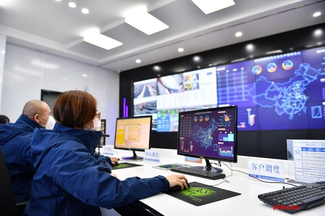 3月5日,合肥庐阳经济开发区辖区中铁四局物资公司“智慧仓储”基地智能化调度室,技术人员正在实时监控调度钢材出货及处理来自全国有关省市订单。据悉,企业复工后,一手抓疫情防控,一手抓订单,依托智慧仓储大数据平台,实现智能入库调度、远程开单、远程物流配送、智能排队装货调度,提升工作效率。