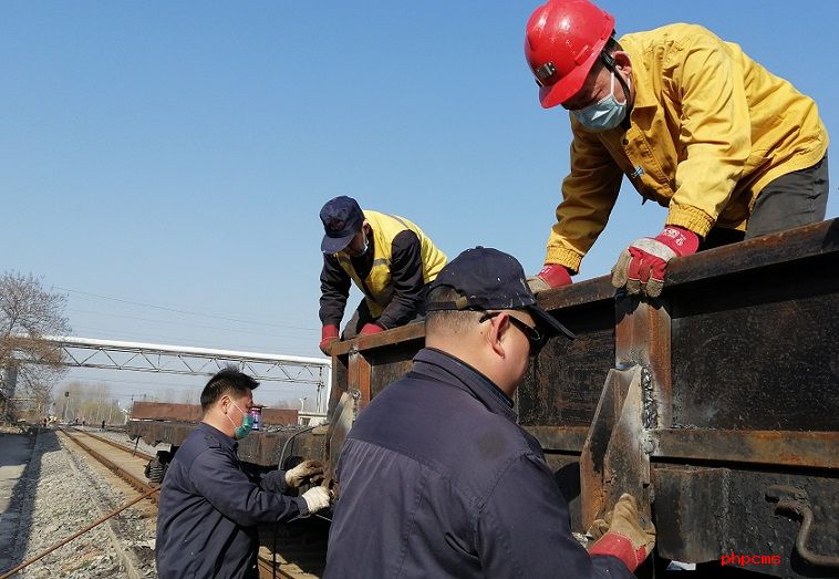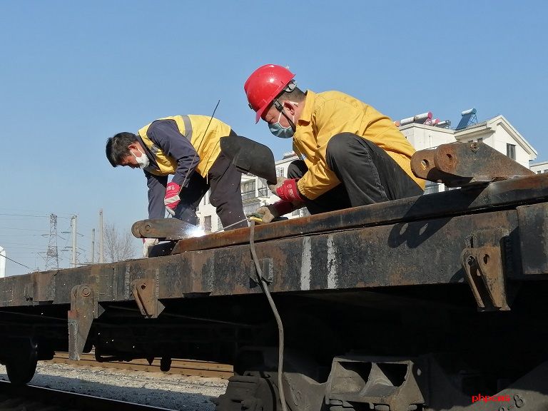 淮北矿业集团铁运处烈山工务段为保证轨道车运输安全,从3月初开始,组织综合桥梁班职工对轨道车牵引大平板的防护门进行周期性更换,此次将更换掉一个大平板上的8个防护门,更换后的防护门更加厚实,抗压性和耐磨损更强。图为,职工为防止卡槽歪斜,在平板车上焊固卡槽。
